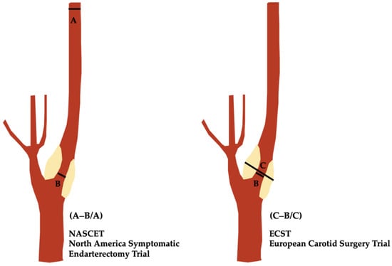 As highlighted above, the results from both the NASCET [9,10] and ECST [11,12] trials showed the effectiveness of revascularization in reducing the risk of strokes and mortality in patients with a severe degree of carotid artery stenosis. These studies primarily utilized the percentage of stenosis in the ICA as the principal metric, offering a clear and reproducible method to determine a patient’s risk of stroke and distinguish between surgical and non-invasive treatment options.