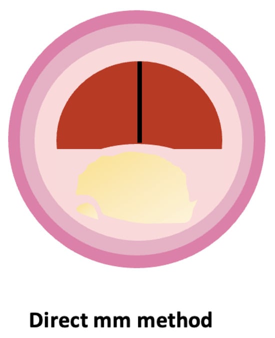 The linear diameter of the narrowest visible stenosis was always the main part of the ratio and the parameter measured by the direct mm approach [18]. Cross-sectional area, which can be measured by pixel-counting digital tools, has been investigated as an alternate method to quantify carotid stenosis, considering that plaques can be irregularly shaped and noncircular. Bartlett compared direct mm with area [20] and found no significant advantage in pixel-counting for area.