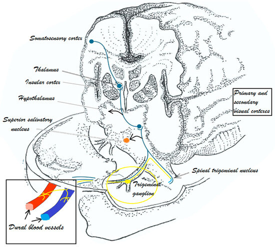 However, migraine is considered a neurovascular headache, meaning that neural processes result in vasodilation [22]. The trigeminovascular system is one of the key factors in migraine pathophysiology [17]. In 1984, Moskowitz premised that the pain transmission in migraine originates in activation of trigeminovascular neurons that innervate meninges and their vessels [17,23]. The process implies activation and sensitization of these neurons.
