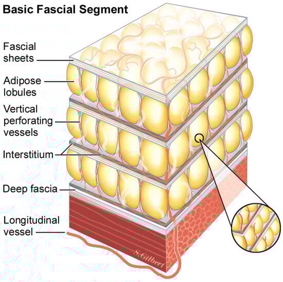 29] and capillary ingrowth along the self-organizing collagen fascial scaffold (2-D sheets/vertical retinaculum). Su et al. showed the superficial fascia to be the origin of adipose cells in rat growth and development. They identified adipose precursor cells, resident in the fascial vasculature (wrapped with interstitium), as the source of adipogenesis. Male rats at one week old were studied by looking at the superficial fascia localized above the hindlimb using a stereomicroscope. They identified a region of fascia, without adipose tissue, characterized by blood vessels, collagen fibers, elastin fibers, fibrocytes, mast cells, and ground substance (i.e., the Interstitium). At seven weeks, they noted the formation of adipose lobules originating from the adventitia of the main blood vessel of the region and stated: