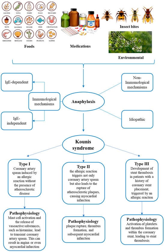 Summary of the main triggering factors of anaphylaxis, pathophysiological mechanisms of anaphylaxis, and types of Kounis syndrome.
