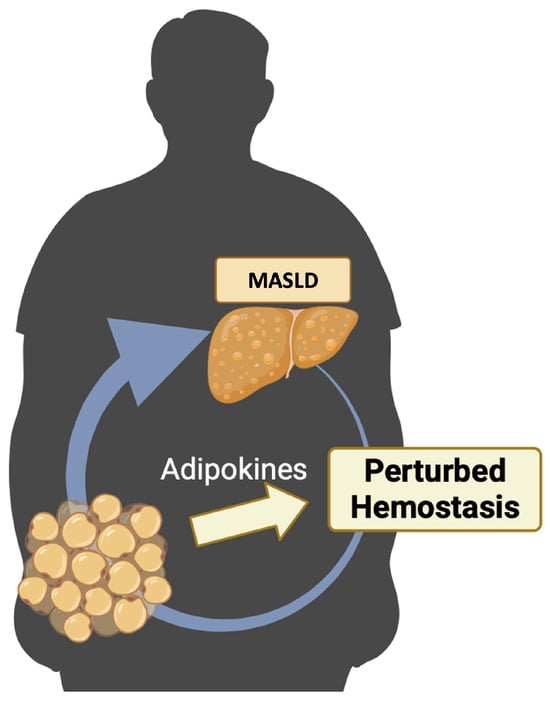 The prevalence of MASLD continues to rise, making it one of the most prevalent chronic liver disorders [2,3]. The global incidence of MASLD is estimated to be 47 cases per 1000 individuals in the population, with a higher prevalence observed among males compared to females [2,3]. MASLD encompasses a range of liver pathologies, from simple steatosis to MASH with inflammation, hepatocyte damage, and fibrosis [4,5,6]. These pathological conditions are frequently correlated with several physiological alterations [7,8] and with obesity or overweight [5,9], both of which are established risk factors for the development of MASLD [10]. In fact, epidemiological studies have demonstrated that the prevalence of MASLD in individuals who are overweight ranges from 22.5% to 44.0% [10]. Conversely, the prevalence of MASLD among obese individuals can reach as high as 90% [10,11,12,13]. However, MASLD disease is a multifaceted condition that affects various aspects of health beyond liver function, including its impact on hemostasis [14,15,16]. Several studies suggest that alterations in coagulation parameters, the fibrinolytic process, and endothelial and platelet functions may play a role in the increased vulnerability and severity of MASLD [14,15,16,17,18,19]. This is not unexpected since the liver fulfills a crucial function in the production of coagulation factors and the maintenance of hemostatic equilibrium [17,20,21]. On the other hand, the liver exhibits close intercommunication with adipose tissue [22,23]. Interestingly, adipose tissue may contribute to the etiology and progression of MASLD by delivering free fatty acids derived from triglyceride lipolysis through the bloodstream to the liver [24] and also acting as an endocrine organ that releases several hormones and cytokines [25,26,27], with adipokines assuming a pivotal role [23,28,29]. Adipokines are involved in regulating energy expenditure, inflammation, and fibrosis in obesity and MASLD [30,31]. Numerous clinical trials have demonstrated altered serum profiles of adipokines in patients with MASLD [30,32]. There is increasing interest in the role of imbalanced adipokines as significant contributors to the altered hemostatic mechanism in MASLD. Gradually, adipokines are being recognized as significant contributors to the dysregulated hemostatic mechanism in MASLD [30,32]. For example, Dalbeni et al. (2022) recently found a positive correlation between the severity of MASLD/MASH and the levels of the hormone leptin, as well as an increase in platelet activation and aggregation, thereby potentially leading to the facilitation of arterial thrombosis [33].