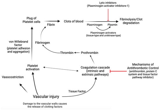 A simplified diagram illustrating the process of hemostasis. Hemostasis is a complex physiological process that relies heavily on the intricate interplay between coagulation factors that facilitate clot formation and those that promote clot dissolution. The maintenance of this delicate equilibrium is of paramount importance for the prevention of excessive bleeding or thrombosis and thus forms a critical aspect of the clinical management of many medical conditions. Created with https://BioRender.com (accessed on 29 November 2023).