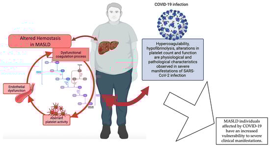 Dysfunctional hemostasis in MASLD. The pathophysiology of MASLD encompasses a complex interplay of various mechanisms, including coagulation abnormalities and platelet and endothelial dysfunction, which collectively contribute to the dysregulation of hemostasis in MASLD individuals. Severe manifestations of MASLD are more likely to occur in individuals with COVID-19, in which hemostasis disruptions appear to play a significant role. Given that liver malfunctioning is a common disturbance between the two diseases, it is possible that the coexistence of COVID-19 disease, which is also distinguished by hemostasis alterations, could exacerbate the hemostatic dysfunction of individuals with MASLD. Created with https://BioRender.com (accessed on 27 November 2023) and modified with Microsoft PowerPoint v.16; MASLD: metabolic dysfunction-associated steatotic liver disease.