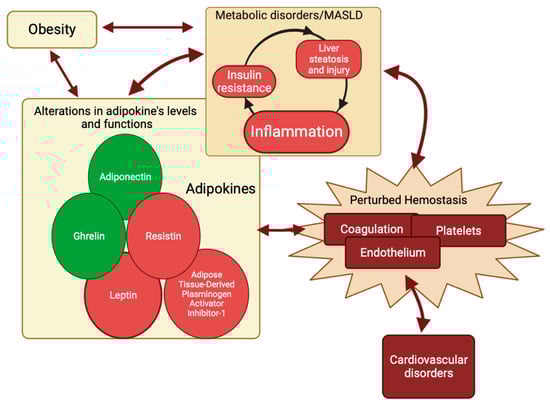 Circuit of perturbed hemostasis. Metabolic inflammation and liver injury are integral components of MASLD. The intricate interplay between these components and the hemostasis is distinguished by mutual influences and the elicitation of alterations. Adipokines have the potential to function as the common factors within this intricate association. Adiponectin and ghrelin (circles in green) have a favorable impact on MASLD’s pathogenesis and hemostasis, while adipose tissue-derived plasminogen inhibitor-1, leptin, and resistin (circles in red) have a detrimental effect on MASLD. Created with https://BioRender.com (accessed on 27 November 2023); MASLD: metabolic dysfunction-associated steatotic liver disease.