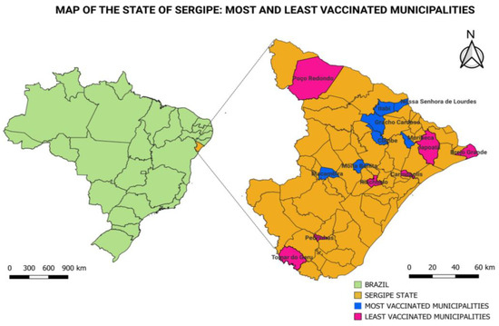 Maps of Brazil and the State of Sergipe with the most and least vaccinated municipalities.