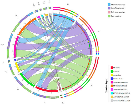 The results were analyzed using IBM® SPSS® Statistics software (version 26.0 for Windows) [33]. Descriptive statistics were determined. Normality tests were conducted considering p > 0.05 for inhomogeneous samples [34]. Chi-square tests of independence (2 × 2), Fisher’s exact test, and prevalence ratio and odds ratio analyses were carried out [35,36,37,38]. To assess the significance of these tests, a p-value < 0.05 was considered statistically significant and, where appropriate, a 95% confidence interval was applied [39]. We used the Circos® graph (http://circos.ca/ (accessed on 13 August 2023)) [40] to visualize the distribution of vaccine combinations in the most and least vaccinated municipalities and to assess IgG antibody distribution with these combinations.