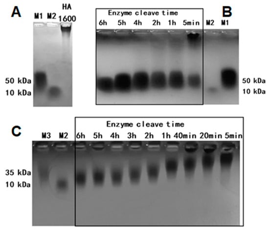 Representative gel electrophoresis of the molecular weight distribution of HA35 and HA1600. (A) HA1600; (B) the HA fragments when HA1600 was cleaved by the rhuPH20 enzyme for 6, 5, 4, 2, and 1 h, and 5 min; (C) the HA fragments when HA1600 was cleaved by the leech hyaluronidase for 6, 5, 4, 3, 2, and 1 h, and 40, 20, and 5 min. M1, M2 and M3: the marker of a 50 kDa, 10 kDa and 35 kDa molecular weight.