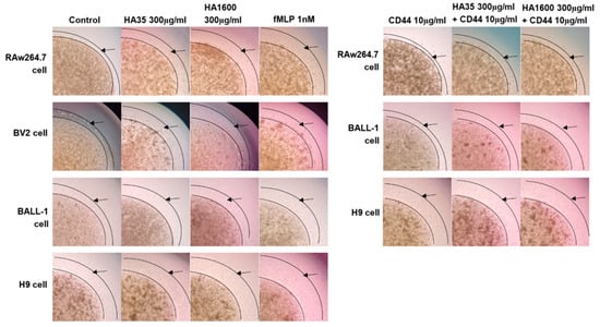 After two passages, RAW264.7, BV2, BALL-1, and H9 cells were harvested, and the cell density was adjusted to 3 × 108 cells/mL using their respective culture media. A 0.8% agarose gel was prepared and sterilized under high pressure. This gel was mixed with cell culture media containing 20% FBS and 1% penicillin/streptomycin in a 1:1 volume ratio. These mixtures were then incubated with the respective cell suspensions in a 1:1 volume ratio and placed in a 37 °C water bath for insulation. A 2 μL volume of the cell–agarose mixture was transferred to the center of each well in a 96-well plate using a pipette, forming a cell drop with a 2 mm diameter, which was then left to solidify at 4 °C. After 15 min of solidification, 100 μL of culture medium containing various treatment agents was added to the wells and cultured at 37 °C for 72 h. The treatments included (1) 300 μg/mL HA35, (2) 300 μg/mL HA1600, (3) 1 nM fMLP, (4) 10 μg/mL anti-CD44 antibody (Abcam, Cambridge, UK), (5) 300 μg/mL HA35 + 10 μg/mL anti-CD44 antibody, and (6) 300 μg/mL HA1600 + 10 μg/mL anti-CD44 antibody. Four parallel testing repetitions were performed for each treatment. The cell preparations were visualized under an inverted phase-contrast microscope at 4× magnification. The radius of the agarose gel droplet was used as a baseline to measure the area at the furthest edge of cell migration from the droplet. ImageJ 1.53k software (NIH, Bethesda, MD, USA) was used to calculate the area difference, representing the migration distance.