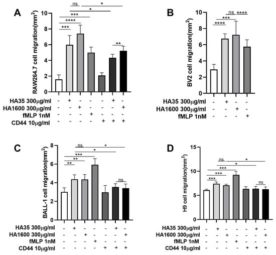 Quantitative analysis of cell migration, determined by measuring the area encompassed by cell migration from the innermost point of the cell-containing droplet to the furthest edge of cell movement into the surrounding culture medium. The results are presented for each cell type, RAW264.7 cells (A), BV2 cells (B), BALL-1 cells (C), and H9 cells (D), with four replicates (n = 4) for each group. ns: no significant (p > 0.05), * p < 0.05, ** p < 0.01, *** p < 0.001, and **** p < 0.0001 for comparison between two groups.