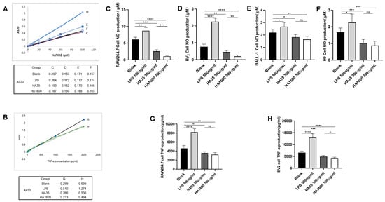 With cells treated with LPS (500 ng/mL) serving as the positive control, the production of TNF-α and NO in RAW264.7 and BV2 cells was significantly reduced by both HA35 and HA1600, as demonstrated in Figure 4. HA35 and HA1600 also downregulated NO generation in BALL-1 and H9 cells. Overall, HA35 and HA1600 exhibited similar effects in downregulating TNF-α and NO production in macrophages, microglia, and lymphocytes in cell culture studies. However, HA1600 showed a more pronounced effect in reducing NO generation in RAW264.7 cells (p < 0.001) and BV2 cells (p < 0.01) compared to HA35.