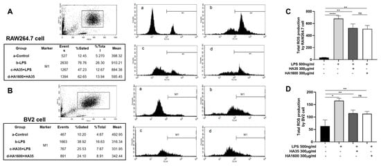 RAW264.7 cells and BV2 cells, which had been centrifuged and adjusted to a cell density of 3 × 106 cells/mL in 200 μL of media, were seeded in 24-well plates. A fluorescent probe, Dihydrorhodamine-123 (DHR-123), for measuring ROS production was added to each well at a final concentration of 5 µM. The cells were then incubated in the dark at 37 °C for 15 min. Subsequently, treatments including 10% FBS, 300 μg/mL HA35 + 10% FBS, and 300 μg/mL HA1600 + 10% FBS were added to wells. The cells were stimulated with 500 ng/mL LPS and incubated for 30 min. Green fluorescence was measured using a flow cytometer with a 488 nm wavelength laser for excitation and the detection of emission at 575 nm. The average fluorescence intensity was labeled as M1, and the total fluorescence intensity was calculated as the product of % gated and the mean fluorescence intensity (MFI).
