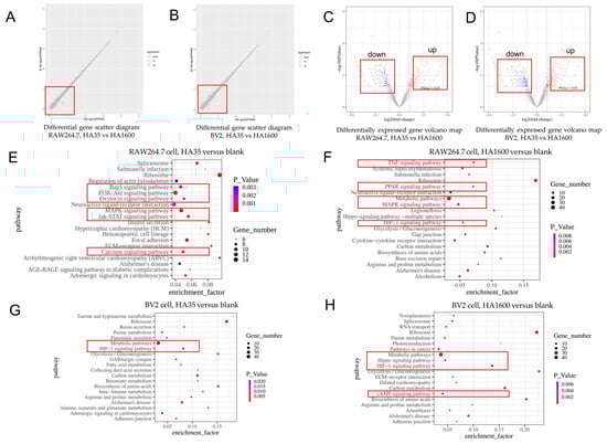 RNA seq analysis of HA35 versus HA1600 for differentially expressed genes in RAW264.7 cells and BV2 cells. (A,C) HA35 versus HA1600 for RAW264.7 cells; (B,D) HA35 versus HA1600 for BV2 cells; (E) RAW264.7 cells, HA35 versus blank; (F) RAW264.7 cells, HA1600 versus blank; (G) BV2 cells, HA35 versus blank; (H) BV2 cells, HA1600 versus blank. A higher number of off-diagonal points suggests a more significant difference in gene expression between the two samples. Points in the volcano plot that are farther from the origin on the x-axis indicate a more significant variation in the gene expression between samples. Larger values on the y-axis indicate the greater significance of differentially expressed genes.