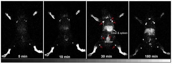 Representative series of mouse iQID images of 125I-HA35 collected at 5, 10, 30, and 180 min post-intradermal injections of the four paws. The image at each time point was generated via the 5 min acquisition of radioactive counts. The fast lymphatic circulation of 125I-HA35 was initially observed at 5 min. The lymph nodes exhibited the highest level of radioactive uptake (counts per pixel) compared to the other organs at 180 min post-injection. As marked by red arrows on a 30 min image, popliteal, inguinal, axillary, brachial, and mandibular lymph nodes were superiorly visualized. Lumbar, iliac, sacral, pancreaticoduodenal, and cervical lymph nodes were also visible. Along with the radioactivity being decreased in the footpad, the radioactive intensity was reversely increased in the lymph nodes, spleen, and liver.