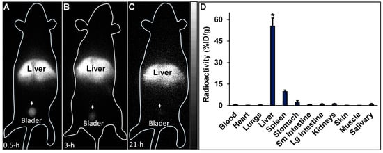 iQID images of 99mTc-HA35 biodistribution in mice, acquired at 0.5, 3, and 21 h post-intravenous injection, are shown in Figure 8. At 0.5 and 3 h after the injection of 99mTc-HA35, the radioactive distribution was predominantly localized in the liver. The spleen was less visible due to its overlap with the liver in the planar images. A moderate amount of radioactivity was observed in the bladder. Twenty-one hours later, the predominant radioactivity still remained in the liver. The kidneys were either invisible or less visible, although minimal radioactivity was still detectable in the bladder. No clearly detectable radioactive accumulation from free 99mTc pertechnetate was observed in the salivary glands, stomach, or thyroid. The in vivo findings obtained via iQID imaging were confirmed by the ex vivo biodistribution measurements, summarized in Figure 8D. These measurements were collected from five other mice euthanized 3 h after 99mTc-HA35 injection. The 3 h iQID images of 99mTc-HA35 in these five mice are available in the Supplemental Data.
