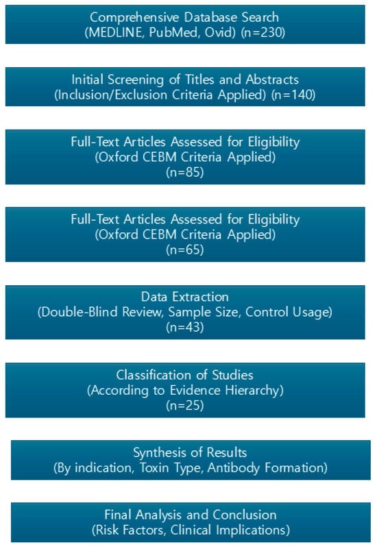 Keywords including “Immunogenicity”, “Neutralizing Antibodies”, “Onabotulinum A”, “Abobotulinum A”, “Incobotulinum A”, and “Botulinum Toxin Type A” were searched in the MEDLINE, PubMed, and Ovid databases for relevant studies published on clinical trials, diagnosis, and treatment (Figure 1). Some papers were further reviewed based on double-blind approach usage, sample size, control usage, randomization usage, and objective endpoint measurements. All studies were classified according to the Oxford Center for Evidence-Based Medicine’s evidence hierarchy (Figure 2).