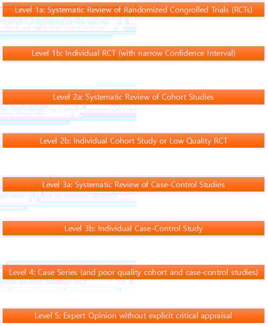 The diagram representing the Oxford Center for Evidence-Based Medicine (CEBM)’s evidence hierarchy. It visually outlines the classification of studies from the highest level of evidence (systematic reviews of RCTs) down to the lowest level (expert opinion without explicit critical appraisal).