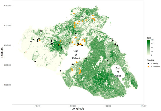 Field observations of M. hartingi (circles) and N. xanthodon (triangles) on the island of Lesvos. The background shading depicts Tree Cover Density (TCD) as a continuous gradient between 0 and 1.