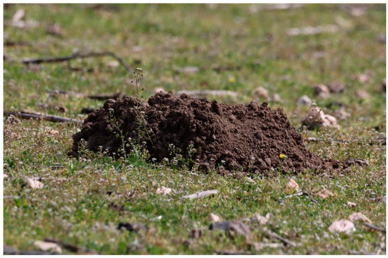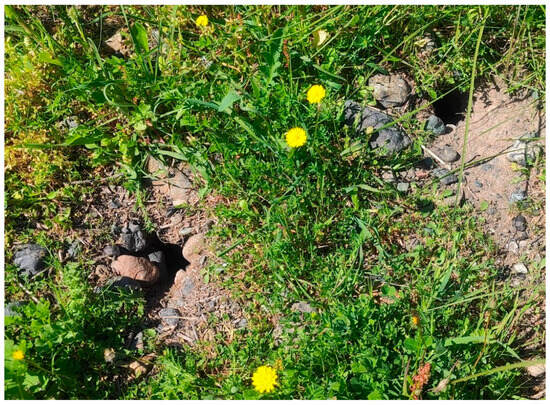 Our efforts were concentrated between January and the end of May for N. xanthodon, matching the breeding period of this species, during which animal activity increases (S.P. Zannetos, personal observation). The excavated soil mounds (see Figure 2) of N. xanthodon could easily be identified even from a distance. To avoid redundancy in our data, we adhered to a consistent minimum distance of 100 m between the soil mounds attributed to each individual N. xanthodon. We focused on M. hartingi from May to November, when burrow holes are more visible due to the vegetation gradually drying up and becoming shorter and less dense. M. hartingi burrows were identified by their numerous uncovered entrance holes (see Figure 3), having an average diameter of 4 to 7 cm (S.P. Zannetos, unpublished data).