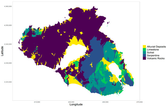 Geology: We used a simplified classification of the island’s geological structure, derived from the geological map shown in Figure 4 [23]. The classification groups the diverse range of geological formations into five categories: (1) limestone, (2) schist, (3) alluvial deposits, (4) serpentine, and (5) volcanic rocks. This geological classification was used as a proxy for soil properties.