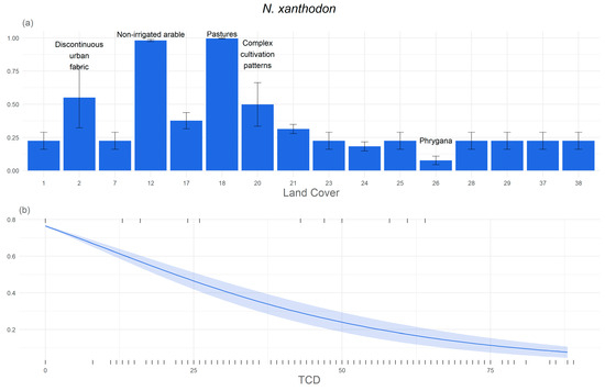 Response curves of habitat suitability to environmental variables: (a) CORINE Land Cover (CLC), (b) Tree Cover Density (TCD), (c) slope, (d) geology, and (e) altitude. These were the variables with a permutation importance higher than 5% according to Maxent model for N.xanthodon. We annotated the most and least favourable CLC categories for better understanding.