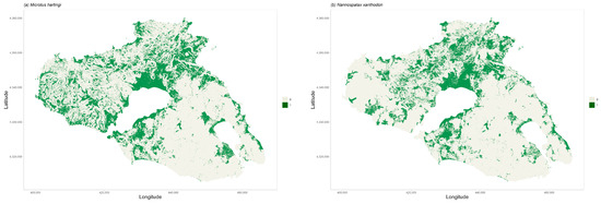 Binary habitat suitability by applying a cut-off threshold based on equal sensitivity and specificity for (a) M. hartingi and (b) N. xanthodont, predicted by the Maxent model.
