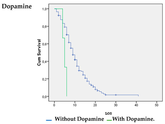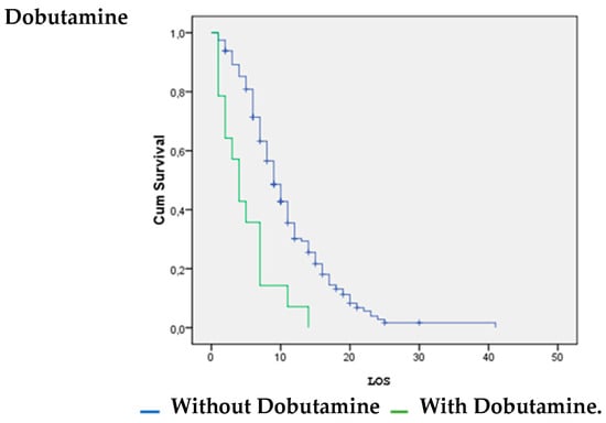 Patients with vasoactive support with noradrenaline were significantly more likely to survive (p = 0.026). Patients without inotropic support with dobutamine (p = 0.00) and dopamine (p = 0.008) were significantly more likely to survive (Figure 1, Figure 2 and Figure 3).