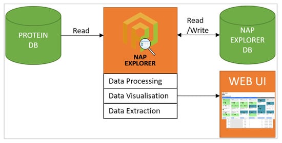 Τhe PROTEIN NAP Explorer Framework. A visual representation of the Web User Interface (WEB UI) architecture, providing searchable user insights based on PROTEIN database data.