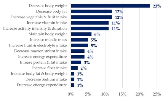 When looking at the overall goal distribution through the PROTEIN database, the most prevalent goals were weight-related, more specifically, “decrease body weight” (23%) and “decrease body fat” (12%), followed by “increase vegetable & fruit intake”, “increase vitamin intake”, and “increase activity intensity & duration” (11%) (Figure 2).