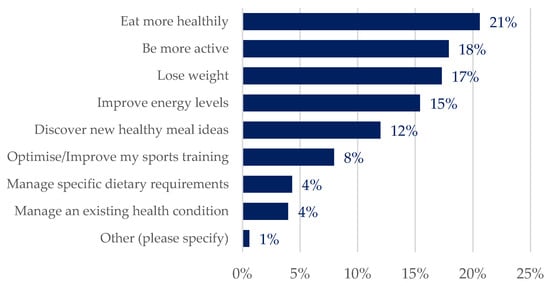 The most common health and wellbeing goals as reported by users were to “eat more healthy” (21%), “be more active” (18%), and “lose weight” (17%). The items “optimize/improve sports training” (8%), “manage a specific dietary requirement”, and “manage an existing health condition” (4% for both) were the least common across all respondents (Figure 3).