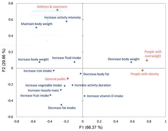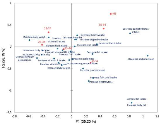 This section presents results only within meal confirmation activity, to identify associations of personal goals with gender, age and user group in meal adherence. The full test statistics can be found in Supplementary Materials Tables S8–S10. Additionally, correspondence analysis (CA) was run to visualise goal associations within meal confirmation activity for age and user groups (Figure 5 and Figure 6).