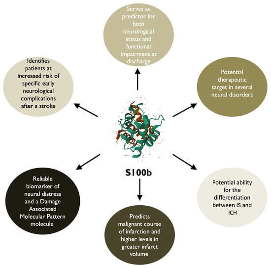 While S100B is not considered a valuable biomarker for diagnosing AIS, it may serve a more useful role as an additional tool for identifying patients at increased risk of specific early neurological complications after a stroke. It could act as a surrogate marker of infarct size and functional outcome [27]. More specific, serum S100B levels measured within 24 h of symptom onset showed an independent correlation with the occurrence of symptomatic intracranial hemorrhage and brain edema in patients with AIS [24]. In addition, increased concentration of S100B before thrombolytic therapy have been found to be an independent risk factor for hemorrhagic transformation in stroke patients. Despite that, the diagnostic accuracy of S100B is too low for it to serve as a reliable biomarker in clinical practice [24]. In patients with ruptured brain arteriovenous malformations, an early elevation in S100B protein serum levels is associated with a poor prognosis. A secondary elevation of S100B protein serum levels has been linked to secondary infarction in these patients [29].