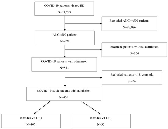 Between April 2021 and September 2022, a total of 98,763 confirmed COVID-19 patients were included from the database, of which only 677 patients had neutropenia when they visited the ED (Figure 1). Excluding patients under the age of 18 and patients who did not require hospitalization, a total of 439 adult COVID-19 patients with neutropenia were included. Patients were further divided into those who received remdesivir treatment (N = 32) and those without remdesivir use (N = 407).
