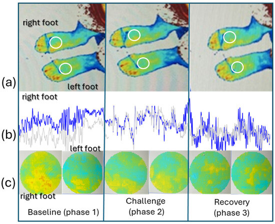 Illustrative example of PSp perfusion recordings during the different phases of the experimental protocol, in one participant, at D0, showing (a) the regions of interest (ROI) selected in both feet, (b) the perfusion line graph obtained from each foot by D0, and (c) the corresponding color contrast images, which represent different light absorption from red blood cells in both feet. As visible in these images, the perfusion asymmetries noted at rest disappear after the challenge during recovery (see text).
