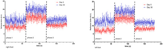 The number of minutes of activity registered by the smartphone application after 30 days of the activity program by D30 was significantly higher than the register at D0 (87.3 ± 12.7 and 205.8 ± 14.7 min, respectively). The baseline perfusion significantly changed in the deeper structures assessed by LDF. To illustrate these changes, we calculated the ratio D0/D30 for each technology. This ratio showed that perfusion in the deeper vessels increased in both feet, mainly in the left foot (76.4%) when compared with the right foot (42.4%), balancing distal perfusion at these points and causing the perfusion asymmetries to disappear. At the superficial vessels, however, asymmetries were still found in baseline measurements (phase 1) with PSp by D30. Consistently lower than D0 measurements, the calculated D0/D30 ratio showed 10.7% on the right and 4.9% on the left, resulting in a persisting significant asymmetry (p = 0.007, Table 2). By D30, no other asymmetries could be detected with either technology after performing the activity sequence or during recovery (Table 2). The D0/D30 ratio for each technology showed that after 30 days of these regular activities, the perfusion increase measured in phase 2 in both feet was balanced and consistent (for LDF, (+)31.3% and (+)30.1% on the right and left feet, respectively; for PSp, (+)6.6% and (+)9.3% on the right and left feet, respectively) as in phase 3 (for LDF (+)28.9% and (+)46.3% on the right and left feet, respectively; for PSp 6.9% and 6.7% on the right and left feet, respectively).