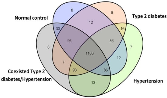 A total of 1584 differentially expressed proteins were identified in the plasma samples. The numbers of proteins identified in the four groups are summarized in Figure 1. The differential identification of peptides in the healthy control, T2DM, HT, and coexisting T2DM/HT groups totaled 1436, 1422, 1419, and 1437, respectively. The healthy control group had eight unique proteins; the T2DM group had six unique proteins; the HT group had seven unique proteins; and the group suffering from T2DM/HT had six unique proteins. Both T2DM and HT contained sixteen proteins, T2DM and T2DM/HT shared seven proteins, and HT and T2DM/HT shared thirteen proteins (Figure 1).