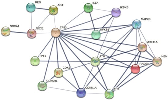 The protein–protein interaction of the unique proteins TPT1 and NBN found in T2DM using STRING 11.5. Proteins involved include DNA repair protein RAD50 (RAD50); double-strand break repair protein MRE11 (MRE11A); tumor protein p53 (TP53); serine protein kinase ATM (ATM); serine/threonine-protein kinase ATR (ATR); cyclin-dependent kinase inhibitor 1 (CDKN1A); cyclin-dependent-like kinase 5 (CDK5); mitogen-activated protein kinase 8 (MAPK8 or JNK1); inhibitor of nuclear factor kappa-B kinase subunit beta (IKBKB); nuclear factor NF-kappa-B (NFKB1); cyclin-dependent kinase 5 activator 1 (CDK5R1); NADPH oxidase activator 1 (NOXA1); NADPH oxidase 1 (NOX1); renin (REN); and angiotensinogen (AGT).