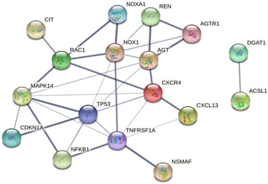 The String (v.11) software revealed the presence of protein–protein interaction in three unique proteins: HT, NSMAF, CIT, and NOXA1. Twelve additional interacting proteins (TNFRSF1A, RAC1, NOX1, AGTR1, AGT, REN, CXCR4, CXCL13, CDKN1A, TP53 (p53), NFKB1, and MAPK14) were added to obtain a more comprehensive understanding of the interaction, as shown in Figure 3. RAS-related C3 botulinum toxin substrate 1 (RAC1) and TNFRSF1A are associated with protein function in the apoptotic pathway, and NOX1, REN, AGTR1, and AGT are proteins that function in developing HT by the renin–angiotensin II mechanism. CXCR4 contributes to the transduction of several signals by increasing intracellular calcium ion levels of CXCL13, also known as a chemotactic for B-lymphocytes. DGAT1 is involved in very-low-density lipoprotein (VLDL) assembly. STITCH 4.0 was also used to identify the interaction network between these three proteins and anti-hypertension drugs. The study revealed interactions between NSMAF, CIT, and NOXA1 and enalapril, a drug commonly used in HT treatment. These findings indicate an explicit relationship between HT and the three unique proteins of HT (Figure S2).
