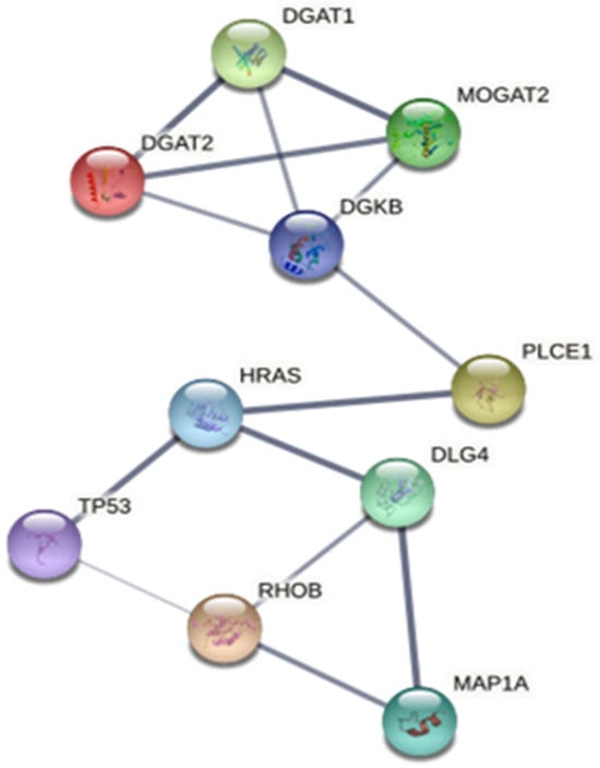 Six unique proteins were expressed only in the plasma of coexisting T2DM/HT patients. Upon bioinformatic analysis using String (v.11) software, it was observed that there were interactions between MAP1A and DGKB, as well as other proteins, as shown in Figure 4. P53 and RhoB were found to be associated with DNA damage responses. HRAS is involved in the activation of Ras protein signal transduction. DLG4 is involved in synaptic plasticity associated with the NMDA receptor. PLCE1 may play a role in cell survival, cell growth, actin organization, and T-cell activation. DGAT2, MOGAT2, and DGAT1 are involved in TG and VLDL synthesis. STITCH 4.0 was also used to identify the interaction network of MAP1A and DGKB with metformin and enalapril (Figure S3). These findings suggest that both MAP1A and DGKB are associated with T2DM and with HT.