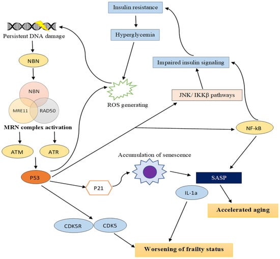 According to our study, a possible mechanism that might explain insulin resistance is the fact that hyperglycemia promotes DDR accumulation, which then induces overexpression of NBN and leads to activation of p53. Chronic activation of p53 can activate p21, promote the survival of senescent cells, and increase the SASP factor. In addition, p53 stimulates activation of inflammatory signaling proteins, including NF-kB, IKKb, and IL1A, and increases ROS generation. Furthermore, DDR accumulation contributes to frailty status deterioration. We found that p53, p21, and ATM interact with proteins related to worsening of frailty status in the proteomics study. We also discovered that p53 is linked to proteins involved in ROS generation and elevated blood pressure. Thus, DNA damage that occurs in diabetic patients might be involved in accelerated aging and age-related conditions like increased frailty, as shown in Figure 5. NBN may play an important role in DNA damage-induced aging and complications of diabetes because this protein initiates DNA damage response signaling. Thus, NBN should be investigated in future studies of the relevance of the link between DM, aging, and DNA damage-related diseases (Figure 5).