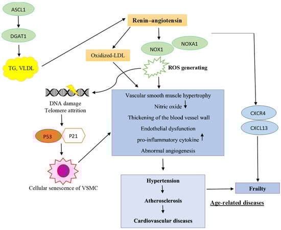 In the HT group, long-chain fatty acid-CoA ligase (ASCL1), which functions in the stimulation of triacylglycerol (TAG), cholesterol synthesis and the functioning of membrane phospholipids (PL), was found to have been up-regulated [41]. Our study also identified direct interaction between ASCL1 and DGAT1 (supplementary data). DGAT1 is involved in very-low-density lipoprotein (VLDL) assembly and TG synthesis. Previous reports have shown that lipid accumulation in blood vessels can enhance the expression of renin–angiotensin system (RAS) components. Activation of RAS also induces the accumulation of oxidized low-density lipoproteins (LDL) in blood vessels, and oxidized LDL can cause endothelial dysfunction and HT. On the other hand, activation of RAS can increase vasoconstriction and free radical production, which foster both HT and atherosclerosis [42,43]. We also found overexpression of NADPH oxidase activator 1 (NOXA1) in the plasma of HT patients. NOXA1 showed strong interaction with NOX1 and proteins associated with developing HT by the renin–angiotensin II mechanism (AGTR1, AGT, and REN). NOX1 played a critical role in inducing oxidative stress and subsequent cellular senescence, as well as age-related diseases such as HT and CVDs caused by angiotensin II (Ang II). NOXA1 also played an important role in generating ROS, because NOX1 oxidase activity requires cytosolic NOXA1. NOX1 expression occurs in endothelial cells, adventitial cells, and vascular smooth muscle cells (VSMCs) of human vascular and heart tissue, which are up-regulated by angiotensin II and pro-inflammatory cytokines in blood vessel walls under pathologic conditions. The overexpression of NOX1 can induce vascular smooth muscle hypertrophy via the angiotensin II mechanism. Ang II increases the production of ROS by stimulating the activation of NOX1, which is involved in the initiation and progression of HT through reduction of the bioavailability of nitric oxide, which serves as an important component in the development of increased blood pressure. NOX1 is also involved with the thickening of blood vessel walls, abnormal angiogenesis, atherosclerosis, and cellular senescence of VSMCs. It is known that too many ROS caused by Ang II activating NOX1 in vascular walls can speed up the aging process of cells. Oxidative stress is well established as a key regulator of age-induced endothelial dysfunction and the renin–angiotensin–aldosterone system (RAAS). We also found that NOXA1-NOX1 showed mild interaction with markers of senescence (p53 and/or p21-mediated p53). It has been reported that ROS generation by Ang II-stimulated NOX1 activation leads to telomere attrition and increased DNA damage, which, in turn, leads to activation of p53 and p21. The p21 has been identified as a SASP and a key factor in the progression of vascular diseases. Oxidative stress can lead to the buildup of senescent VSMCs in arteries, which is linked to abnormal vascular remodeling and stiffening of the arteries as people age. These senescent cells, through the SASP, may also contribute to the spread of senescence in the adventitia and endothelium, as well as the recruitment of inflammatory cells [44,45,46,47,48,49,50,51,52,53,54]. Interestingly, CXCL13, which is associated with frailty status [38], shows interaction with NOX1-Ang II proteins via CXCR4. The operation of the mechanism is shown in Figure 5. However, we found that NBN, which was only expressed in the T2DM groups, demonstrates a stronger correlation with p53, which in turn interacts with the worsening of frailty status marker proteins, compared to NOXA1. This suggests that T2DM subjects might be at greater risk for worsening of frailty status than hypertensive groups. In summary, excessive ROS production by Ang II-stimulated NOX1 activation induces inflammation, accumulation of senescent VSMCs, and abnormal angiogenesis, contributing to aging and to diseases prominent in the elderly, e.g., HT, atherosclerosis, diabetes, frailty, and CVDs. Studies have also reported overexpression of NOX1 in patients with CVDs, and NOX1 has been suggested as a therapeutic target for HT and CVDs through reduction of oxidative stress [48]. In addition, NOXA1 has also been reported to be up-regulated in aortas and atherosclerotic lesions, because NOXA1 is a critical component of VSMC NADPH oxidase [50]. We suggest that both NOX1 and NOXA1 may play important roles in the progression of age-related diseases and conditions, and they may be both therapeutic targets and monitoring biomarkers (Figure 6).