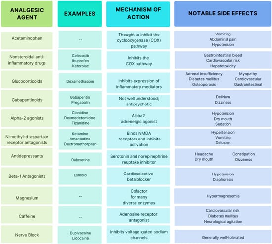 Multimodal analgesia (MMA) can be an opioid-sparing technique that utilizes a combination of analgesics with different mechanisms of action [,]. Alternative terms include opioid free anesthesia (OFA) or balanced anesthesia with an opioid-sparing approach []. Multimodal analgesia has been advocated as the pharmacologic approach of choice []. Considerations when implementing multimodal analgesia includes side effects, drug-drug interactions, and procedure-specific recovery pathways []. Potential agents with evidence of analgesic effect are included in Figure 1.