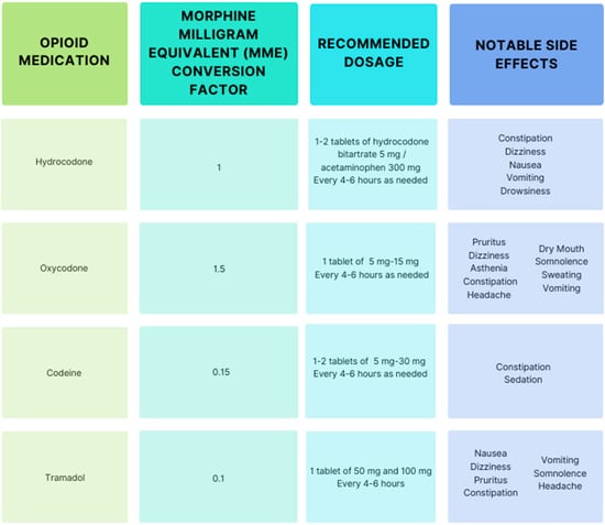 In general, the most commonly prescribed oral opioids for postoperative pain management include hydrocodone–acetaminophen, oxycodone–acetaminophen, codeine, and tramadol []. Common opioids, their morphine milligram equivalent (MME) conversion factor, the recommended oral tablet dosage post operation, and notable side effects (excluding misuse and misuse-related effects) are included in Figure 2. Of note, the CDC recommends considering the potential side effects of increasing opioid dosage to greater than 50 MME [].