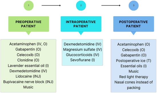 Options for managing pain in the preoperative phase includes intravenous or oral acetaminophen, oral gabapentin, oral celecoxib, oral clonidine, and lavender essential oil by inhalation, with intravenous dexmedetomidine, injected lidocaine, injected bupivacaine, and music in the updated protocol. In the intraoperative phase, non-opioid analgesia options include intravenous dexmedetomidine and glucocorticoids; intravenous magnesium sulfate and inhalation sevoflurane are updated additions to the protocol. For the postoperative patient, analgesic agents in the prior protocol included oral acetaminophen, oral celecoxib, oral gabapentin, nasal cones, essential oils, red light therapy, and postoperative ice; with music being the only major new addition to this phase of the protocol. Preferred analgesic agents include, as follows: preoperatively, 1000 mg of oral acetaminophen, 200 mg of oral celecoxib twice daily for 5 days, and 1200 mg of oral gabapentin; intraoperatively, 0.75 μg/kg of intravenous dexmedetomidine and 1–2 mg/kg injected lidocaine with an additional 2–4 mg/kg per hour or 1.5 cc total bupivacaine nerve block injected along the infraorbital area bilaterally and in the subnasal region; and postoperatively, 5 mg of oral acetaminophen and 400 mg of oral celecoxib. Potential alternatives for patients with special medical restrictions include substituting ibuprofen and avoiding celecoxib in patients with sulfa allergy, avoiding clonidine in patients with hypotension, and a preference for ketorolac in patients with liver metabolism dysfunction.