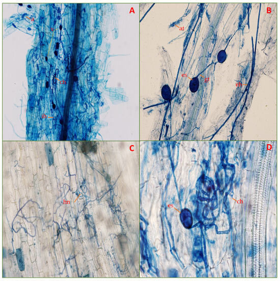 (A–D): The photomicrographs of colonized C. ciliaris roots taken under a microscope (10 × 40 magnification) show the perfect abundance of AMF colonization under different levels of salinity treatments. Perfect colonization is evident by the presence of: (v) vesicles; (a) arbuscules; (ch) coiled hyphae; (ih) interradical hyphae; (at) arbuscular trunk; (es) extra-radical spore; (eh) extraradical hyphae; (gt) germinating tube; and (hn) hyphal network.
