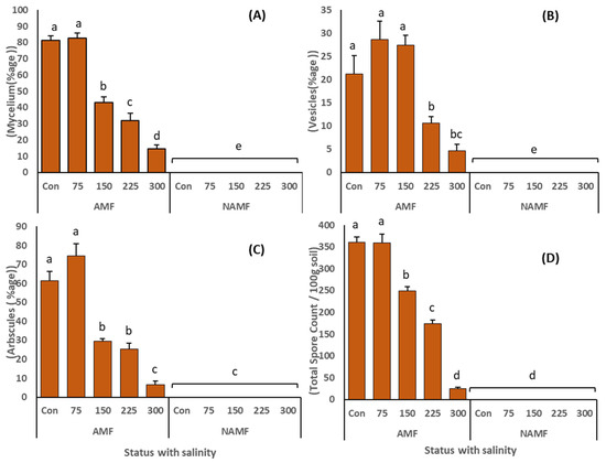 In the present study, the C. ciliaris roots were colonized by AMF under all the salinity levels (Figure 2). This behavior of AMF is in harmony with previous studies where the plants were easily colonized by AMF under saline conditions [2,50]. The microscopic study of roots depicted the presence of all the colonization structures, viz., mycelium, vesicles, and arbuscules (Figure 2). However, the rate of colonization was significantly reduced by the increasing salinity. Moreover, our results depicted a significant decline in AMF sporulation under increasing NaCl application (Figure 2). These results are in accordance with previous studies wherein high levels of salt in the soil hindered spore germination, impeded hyphal growth, decreased the production of vesicles and arbuscules and hampered sporulation [51,52]. The increase in mycelial and arbuscular formation in the roots of C. ciliaris at the salinity levels of 75 mM and 150 mM could be because the salinity stress induced the speedy formation of these colonization structures as an adaptive measure for AMF to complete its life cycle [53]. Additionally, our observations align with the theory that AMF spend most of their resources on storage capacity in the roots under stressed conditions [54]. These results are supported by previous studies [2,55] and explain the improved growth of plants under salinity stress.