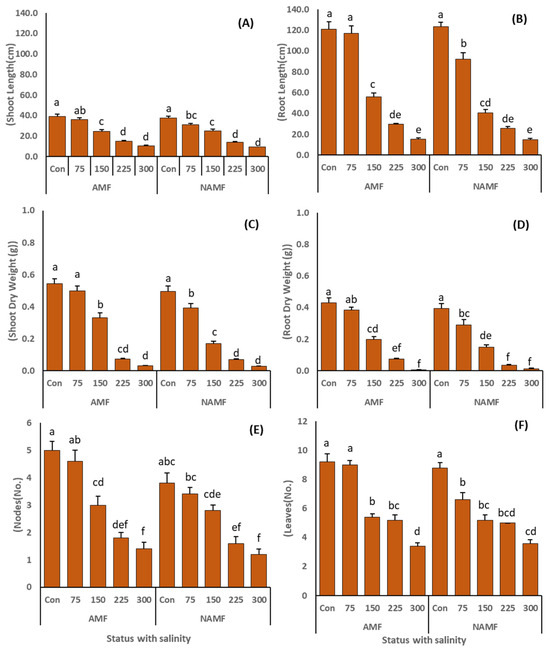 (A–F): indicates the role of AMF application as consortium (C. etunicatum, F. mosseae, R. fasciculatum, and R. intraradices) on vegetative growth factors such as (A) shoot length (SL), (B) root length (RL), (C) shoot dry weight (SDW), (D) root dry weight (RDW), (E) nodes (no/plant) and (F) leaves (no/plant) of C. ciliaris plants grown under salinity stress. The results are presented as a mean ± standard error of five replicates. Different letters on top of the bars indicate the significant difference in treatments p = 0.05 (Tukey’s HSD test).