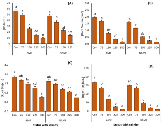 (A–D): indicates the role of AMF application as consortium (C. etunicatum, F. mosseae, R. fasciculatum, and R. intraradices) on root indices such as (A) root surface area (RSA, cm2), (B) root volume (RV, cm3), (C) root diameter (RD, cm), and (D) number of roots (RT, no/plant) of C. ciliaris plants grown under salinity stress. The results are presented as a mean ± standard error of five replicates. Different letters on top of the bars indicate the significant difference in treatments p = 0.05 (Tukey’s HSD test).