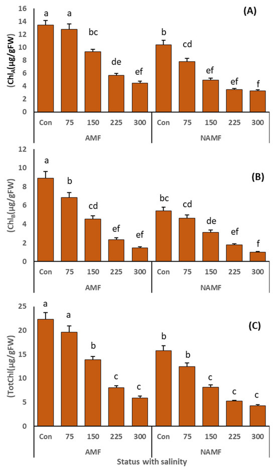 Increasing salinity stress significantly deteriorated the photosynthetic pigments (chlorophyll a, chlorophyll b and total chlorophyll) in both AMF and N-AMF-inoculated plants (Figure 5A–C, Table 3). However, the application of AMF alleviated the effects of salinity to a significant extent. Chlorophyll a (13.45 ± 0.68 µg/g fresh weight leaf), chlorophyll b (8.9 ± 0.7 µg/g fresh weight leaf) and total chlorophyll (22.4 ± 1.3 µg/g fresh weight leaf) were highest in the AMF inoculated plants under non-saline conditions followed by the AMF inoculated plants grown under 75 mM salinity stress.