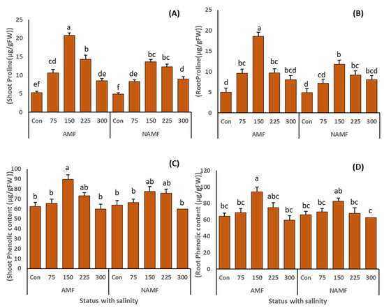 The results for phenolic content showed a similar trend as that of proline (Figure 6C,D). Application of NaCl stress induced the accumulation of total phenolic content for both root and shoot (Table 3). The highest production of phenolics was witnessed in the plants grown at 150 mM salinity stress, and showed a gradual decline at the extreme salinity stress of 300 mM. The production of phenolic compounds was further enhanced by the application of AMF as all AMF-treated plants displayed more phenol accumulation than the N-AMF-treated plants. The highest phenolic content (89.6 ± 4.5 µg/g shoot fresh weight) for shoot and (93.95 ± 5.8 µg/g root fresh weight) for root was recorded in AMF-inoculated plants at 150 mM NaCl stress.